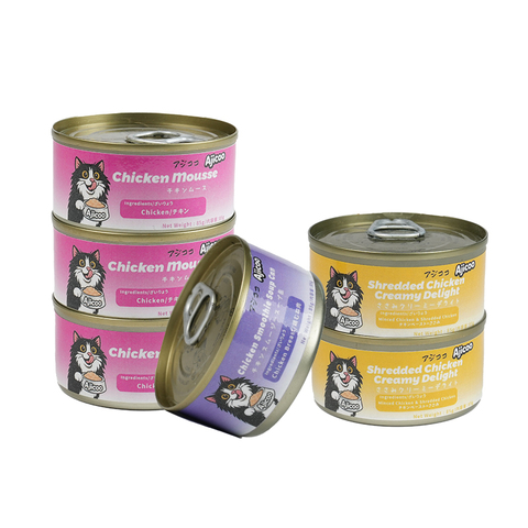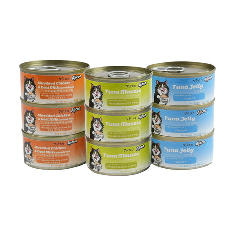 Ajicoo Premium cibo per animali domestici in scatola per gatti e cani tonno Mousse di tonno gelatina di pollo brandelli di latte di capra cibo umido OEM all'ingrosso